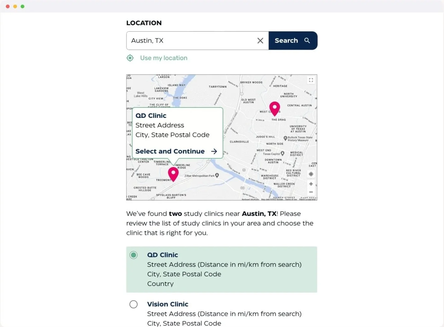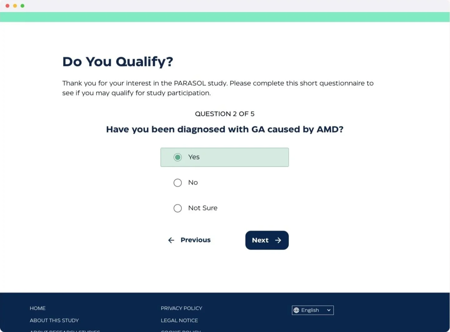 Designed an accessible recruitment website for a global clinical trial targeting Geographic Atrophy, a rare age-related eye disease. The experience guides seniors through a clear eligibility questionnaire, helping them quickly determine if they qualify and connect with nearby study sites. Built under tight timelines, the site supported enrollment across 22 countries and 19 languages, balancing usability, clarity, and compliance.