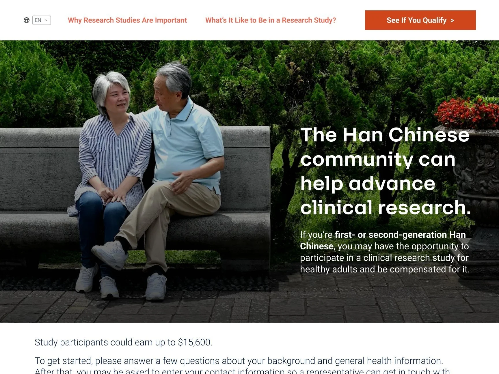 A pharmaceutical company needed a recruitment website that could be easily adapted to fit a variety of Phase I clinical trials. The first trial had three target demographics with different participation requirements, so the landing pages needed consistency while still speaking to each demographic. Screening questionnaires needed to be flexible and adaptable.
