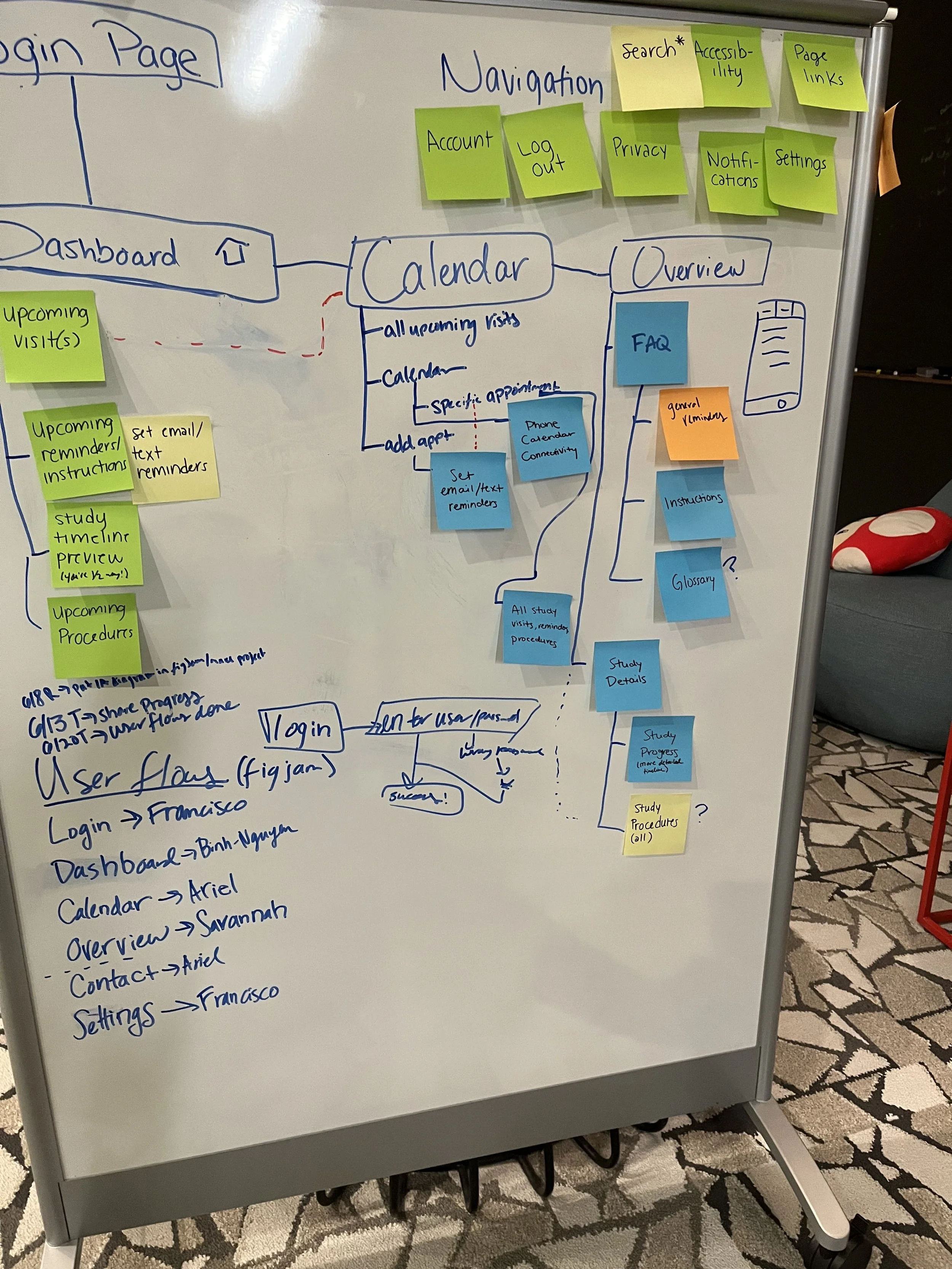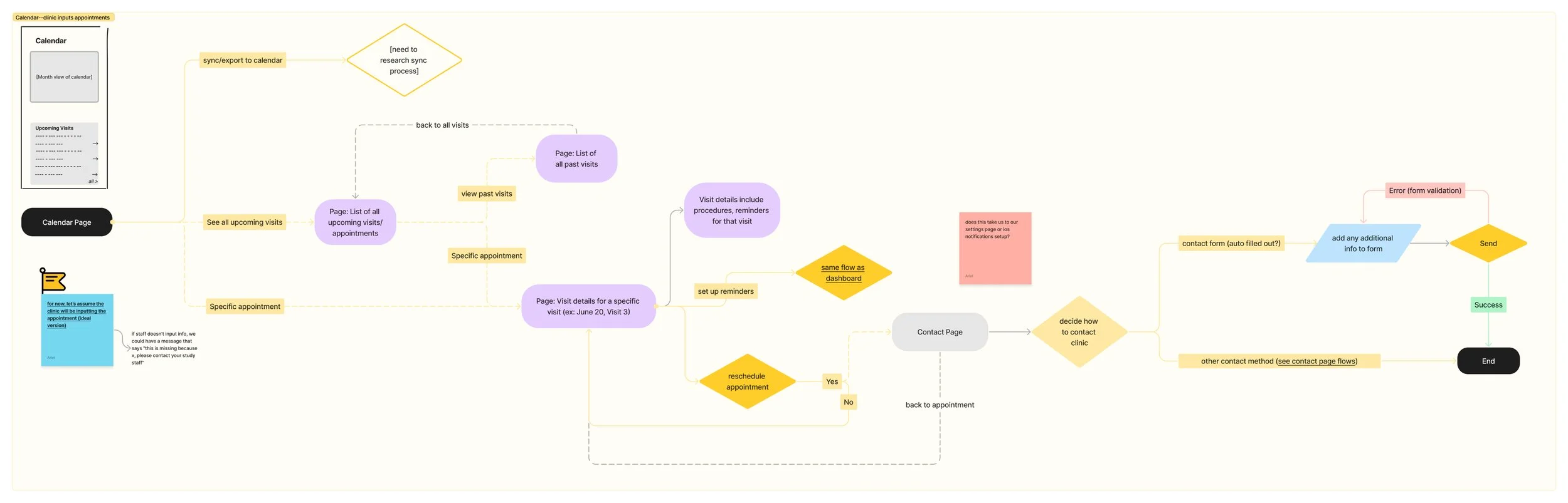 Our initial design relied upon the clinic staff inputting patient appointments and tying them to specific study visits. However, during the lofi stage, we were asked to remove any required interaction from the site staff. This led us to remap the flow for the calendar section in particular.