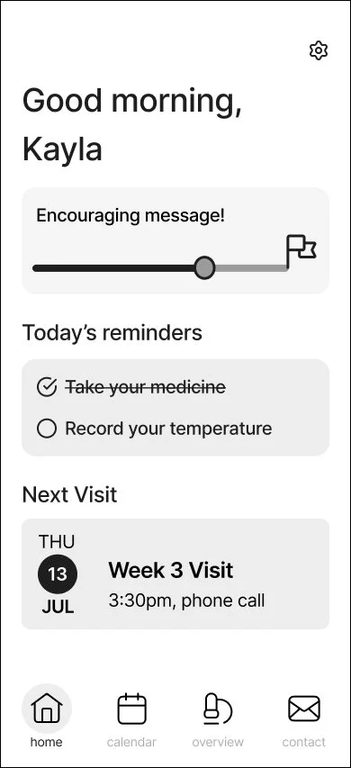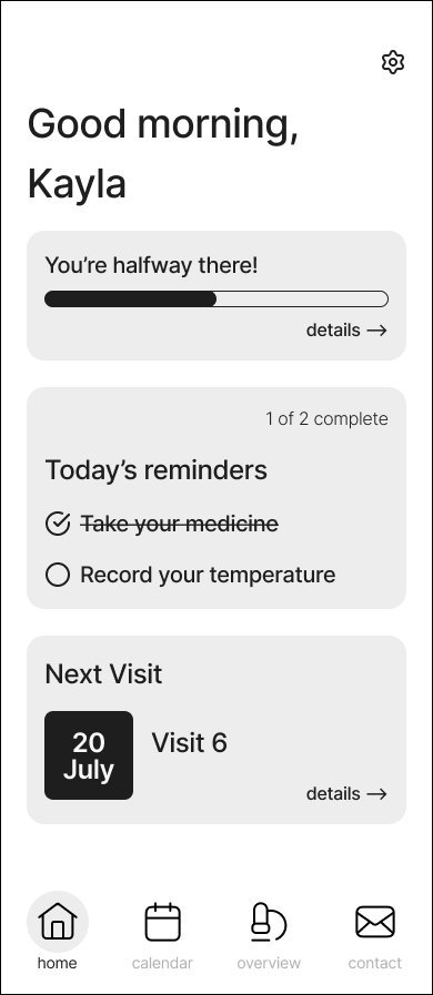Once we settled our lofi design, we moved into mid-fidelity wireframes and basic prototyping to see how the app flowed. During this time, we also shared the prototype with members of the larger Creative and PM teams. The PMs in particular had really valuable insight into tools that clients had been looking for, such as e-diaries, symptom trackers, and gamification.