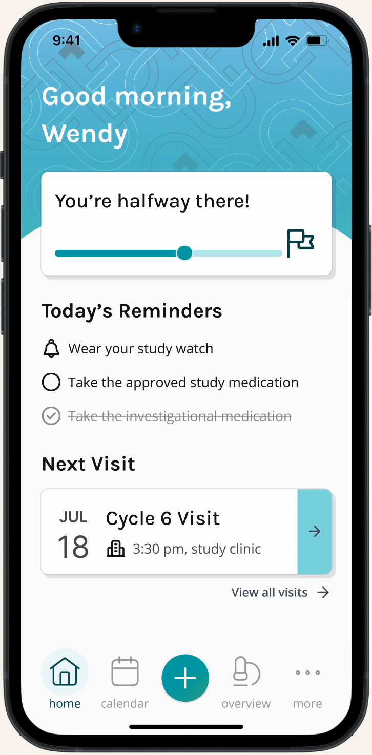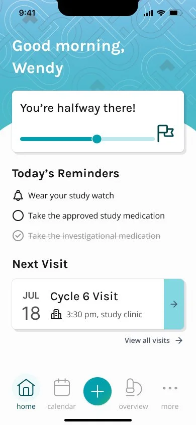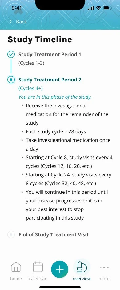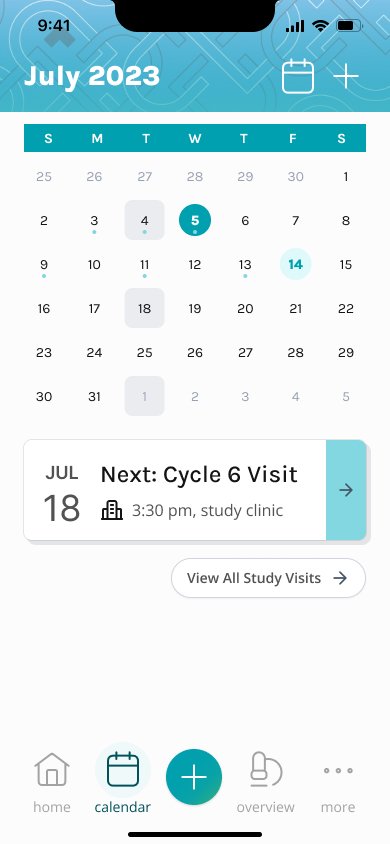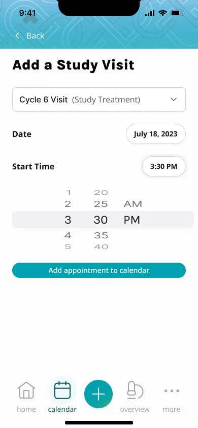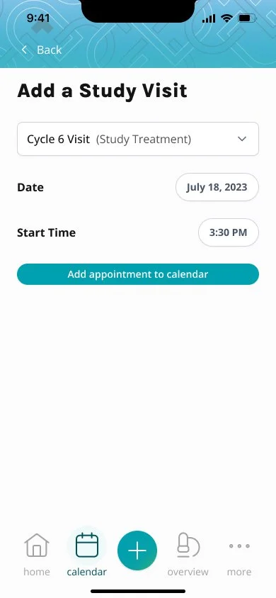 The process of adding appointments and syncing them to study visits had to be shifted over to the study participant, rather than being input by the staff. This feature was a core part of the app, since the study visit the patient is on will affect their study progress, and daily reminders. Sometimes this can be confusing for study participants, so we aimed to make the process as smooth and clear as we could.