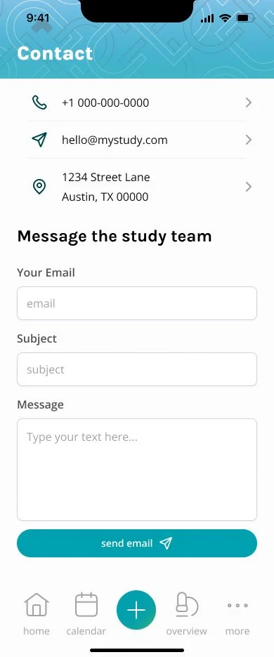 high fidelity screens: the teal color scheme and banner graphic are set up to be quickly updated using Figma’s variables, so that branding may quickly be adapted for each study