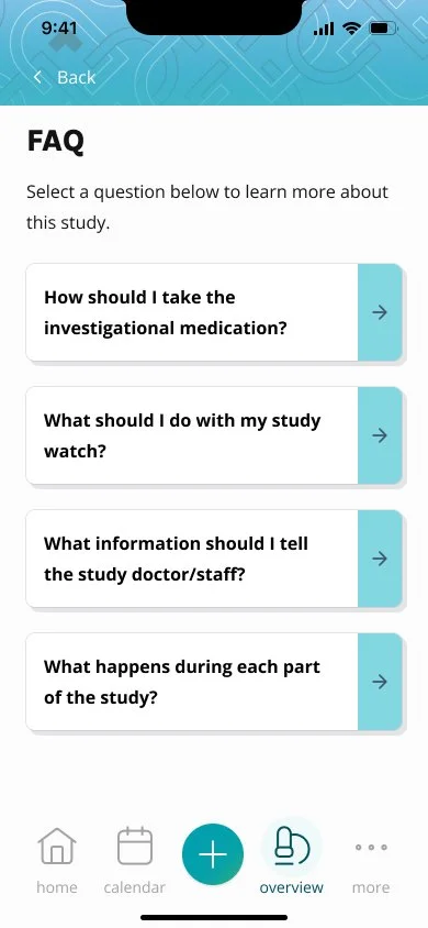 After research into the clinical trial experience, speaking with past study participants, QD Connect was conceived to help patients navigate the complexities of clinical trial participation. Our goals were to create an app that could easily slot into their existing routines, check their daily study responsibilities, understand what each study visit would look like, and easily contact study staff. For the study teams and sponsors, we aimed to make it easier to update available information, complying with protocol updates, and improve patient retention.