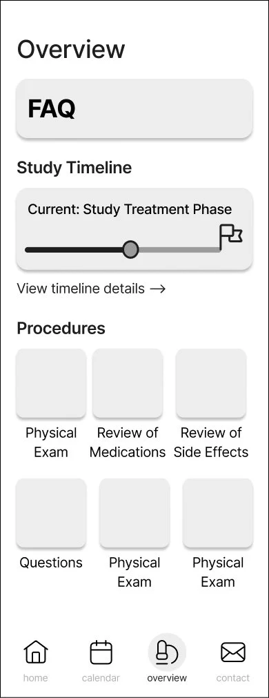 When it came time to create low-fidelity wireframes, our team divided the work. I mainly owned the wireframes for the home dashboard and study overview pages, with input into some sections of the calendar and other pages.